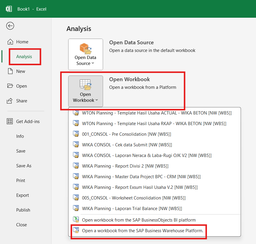 - Untuk mengakses BW, silahkan buka excel lalu pilih tab Analysis -> Insert Data Source -> Select Data Source For Analysis
